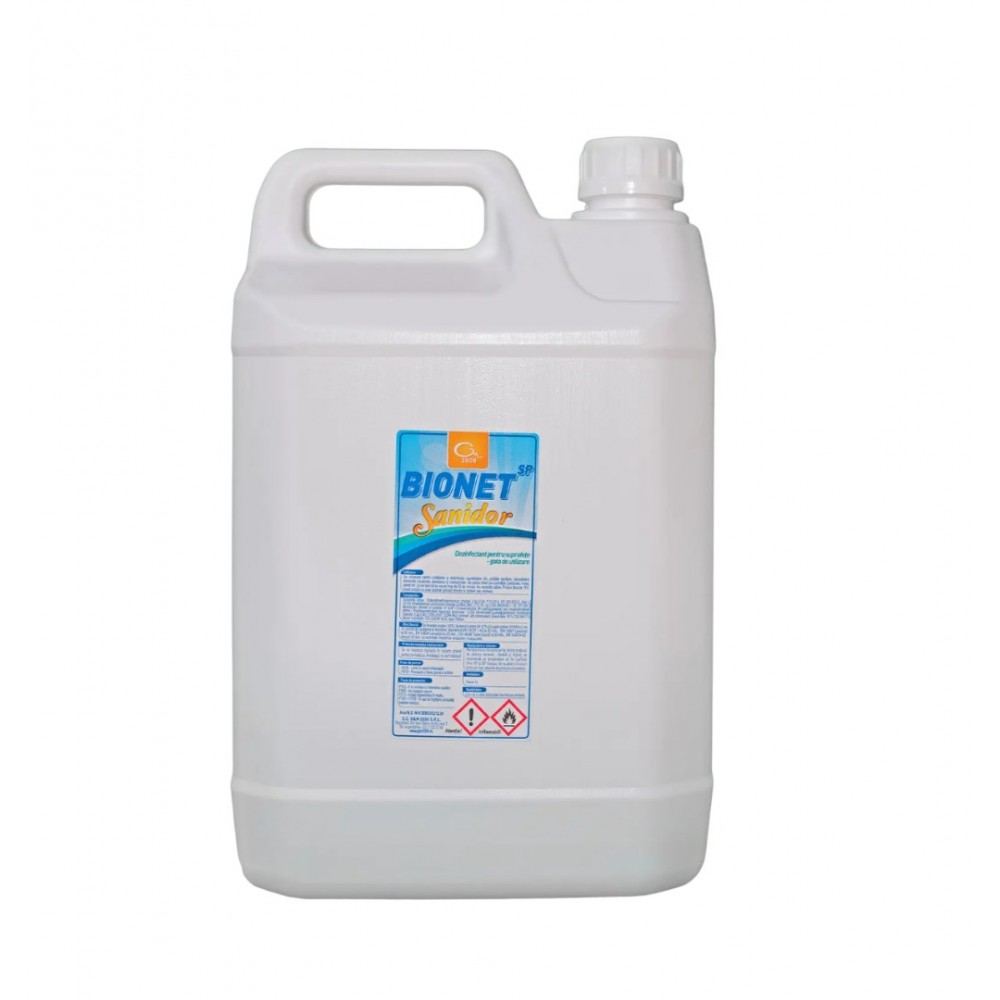 Dezinfectantul Bionet SP Sanidor este pregatit pentru folosire, are aspect incolor, miros placut, dezinfectant de contact fara aldehide, hidroalcoolizat