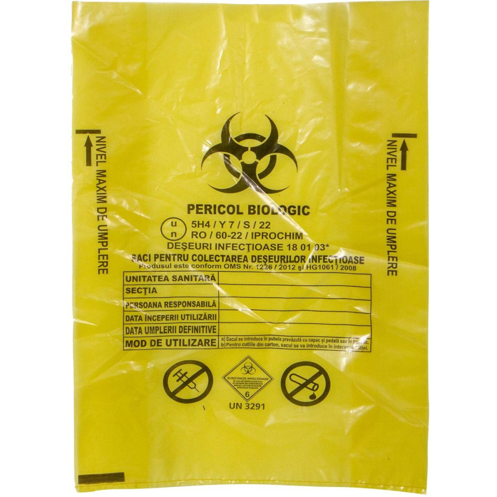Cutiile sunt prevazute in interior cu saci galbeni din polietilena si sigilii de unica folosinta. Grosimea polietilenei din care este confectionat sacul este cuprinsa intre 50 – 70 μ. Aceste cutii se folosesc pentru colectarea deseurilor anatomo-patologice care nu sunt obiecte ascutite. Acestea sunt galbene, cu o banda rosie si semnalate corespunzator cu Biohazard. Acestea sunt marcate conform standardelor Natiunilor Unite (UN) in conformitate cu Acordul european referitor la transportul rutier international al marfurilor periculoase (ADR). Executia cutiilor se va face in conformitate cu un program de asigurare al calitatii ISO 9001, astfel incat fiecare cutie sa corespunda prevederilor in vigoare.