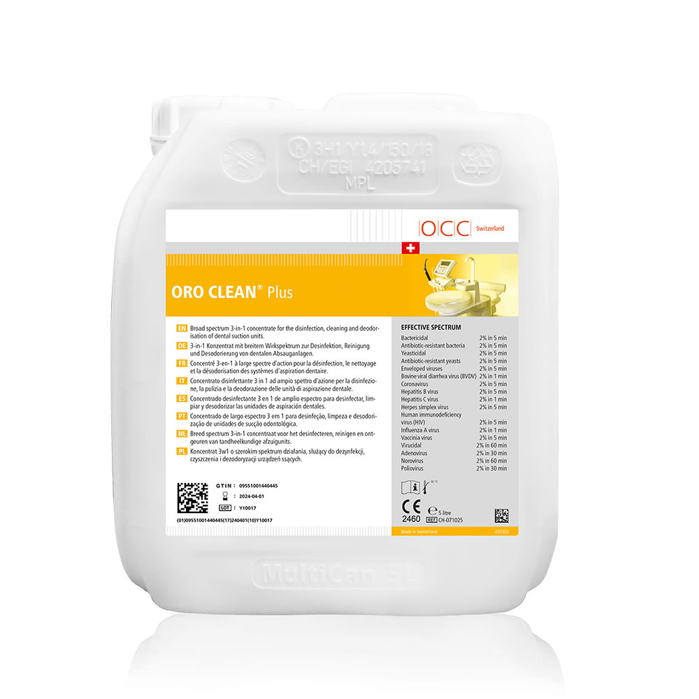 ORO Clean Plus este un produs dezinfectant-detergent concentrat extrem de eficient destinat dezinfecției şi curățării sistemelor de aspirație, scuipătoarelor și separatoarelor de amalgam.