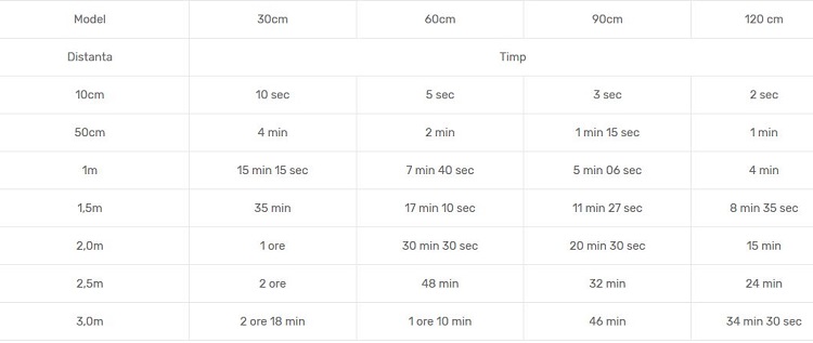 Timpul expunerii LED UVC la diferite distante cu eficienta 99% pentru a inactiva microorganismele: