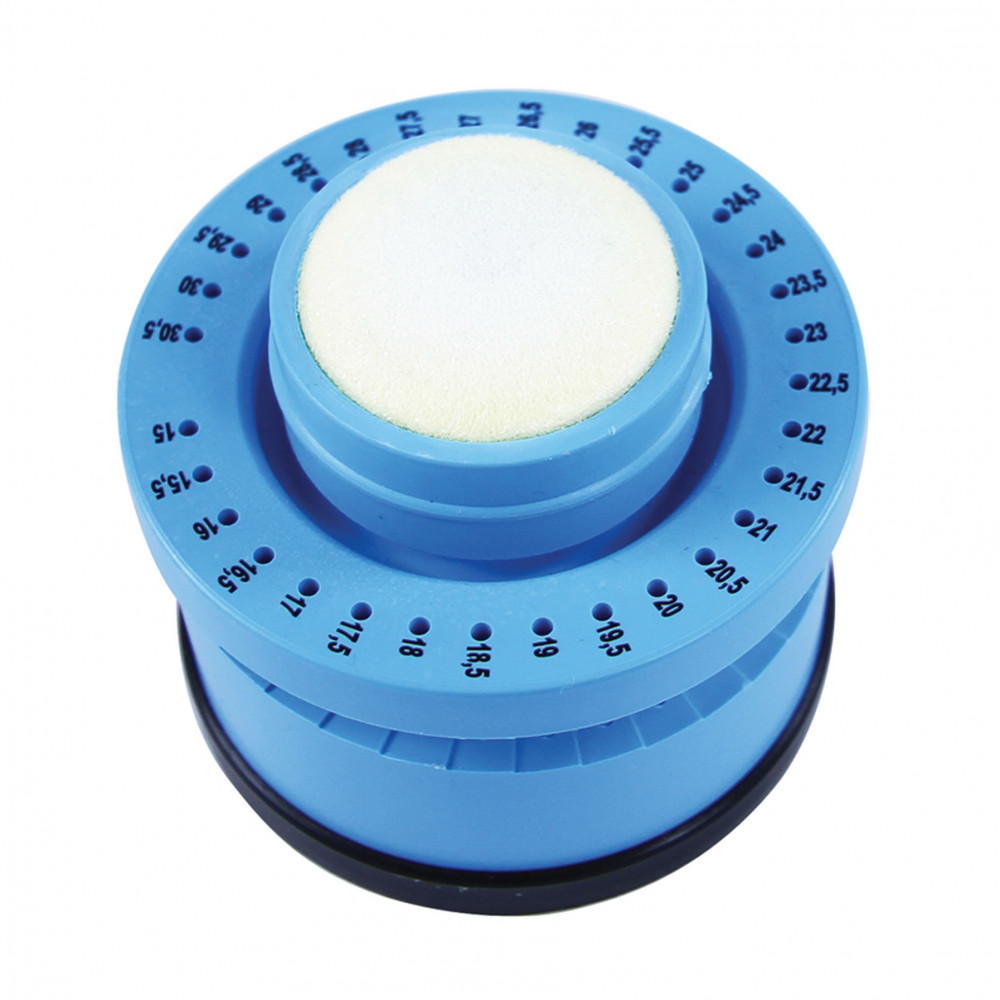 Suport sterilizare ace, 16 orificii si burete, dimensiuni: 7.4x6.8cm, de culoare albastra, realizat din poliamida, sub forma de container rotund.