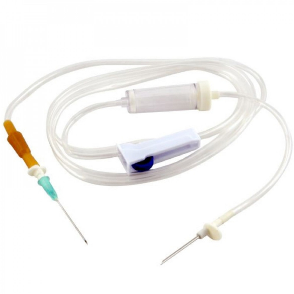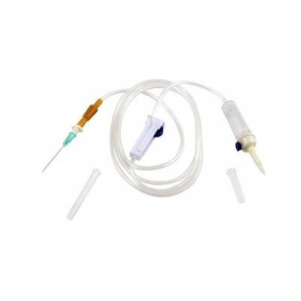Trusa perfuzie sterila cu ac 21G si spike metalic (25buc). Acul din otel-inox 21Gx 1 1/2 ", siliconate, netoxice. Camera de aer cu picurator si filtru care nu permite trecerea impuritatilor.Dispozitiv de reglare a debitului solutiei perfuzabile.